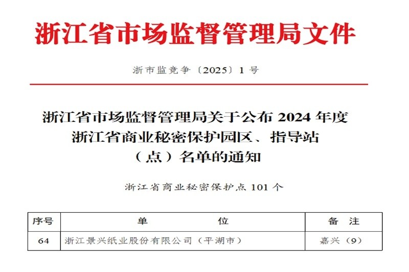 近日,浙江省市場(chǎng)監(jiān)督管理局揭曉2024年度浙江省商業(yè)秘密保護(hù)園區(qū)、指導(dǎo)站(點(diǎn))的名單,浙江景興紙業(yè)股份有限公司憑借其出色的商業(yè)秘密保護(hù)工作,成功躋身榜單,成為平湖市獨(dú)攬此殊榮的佼佼者。